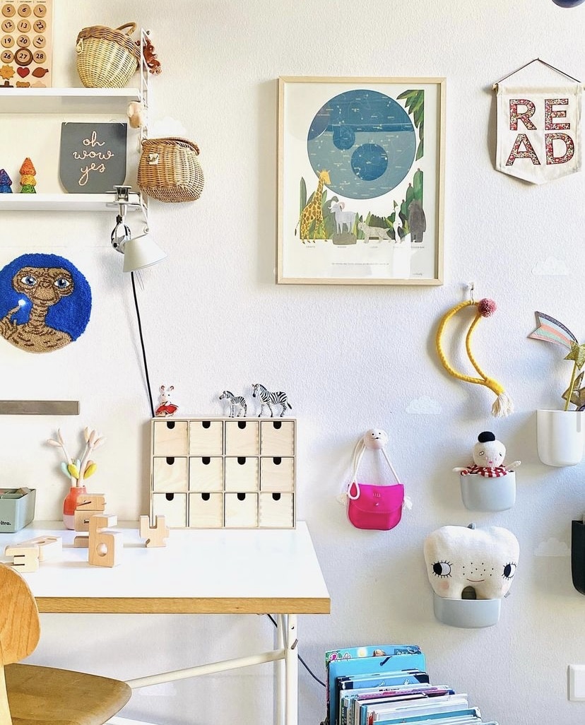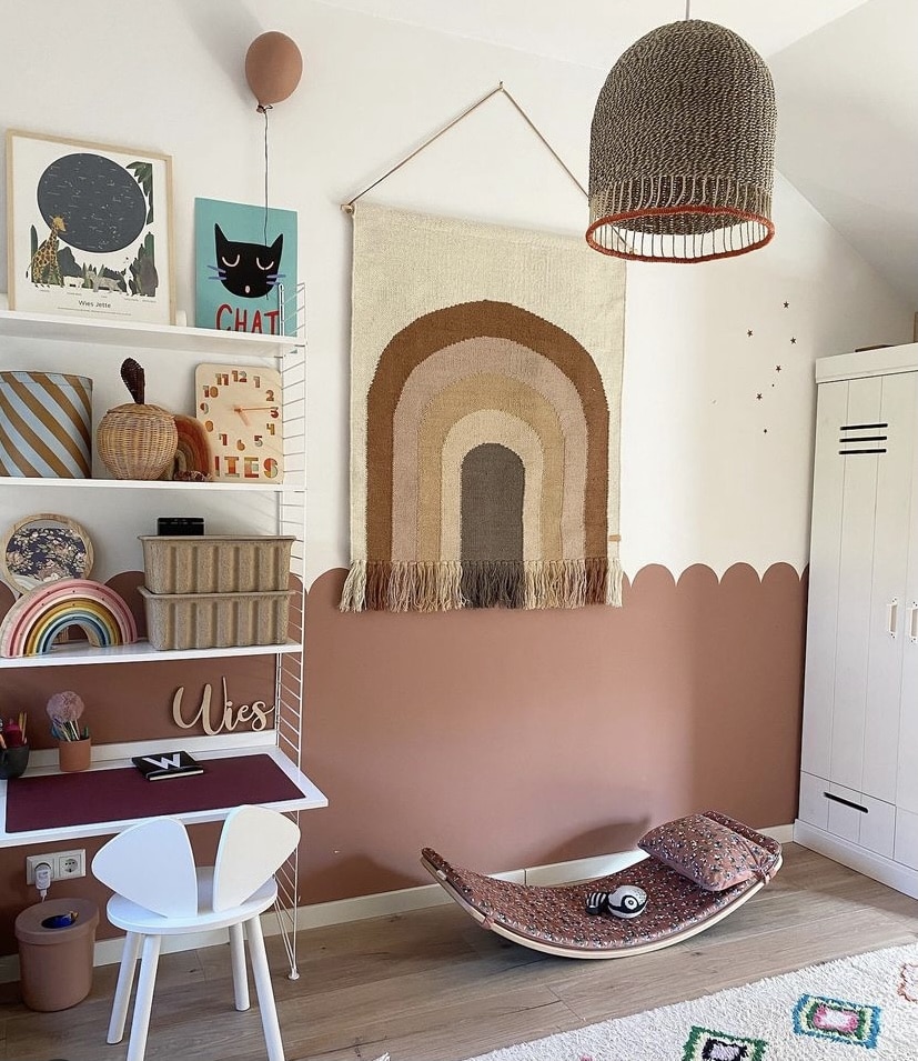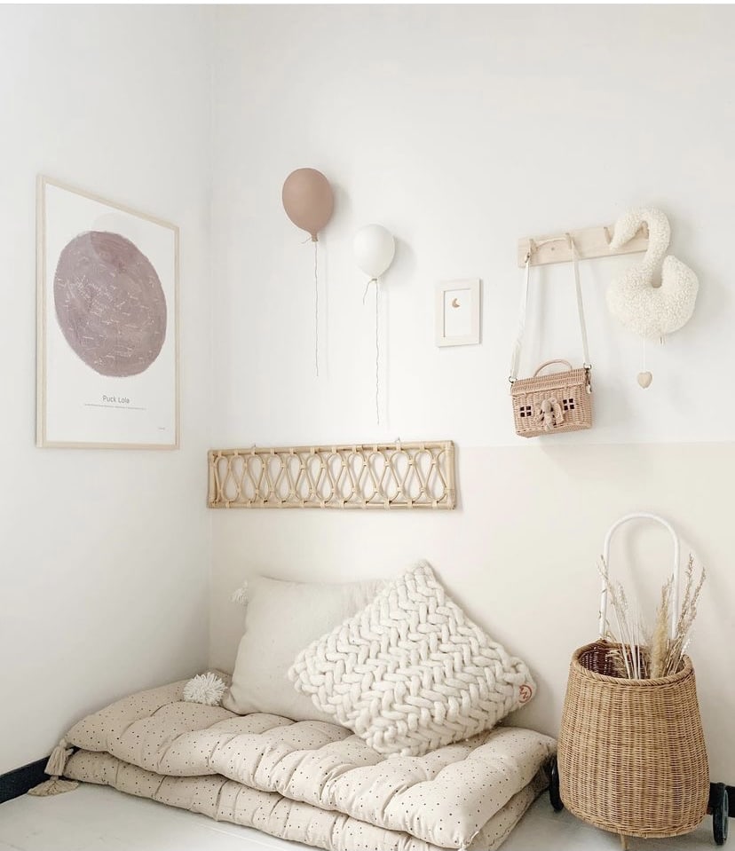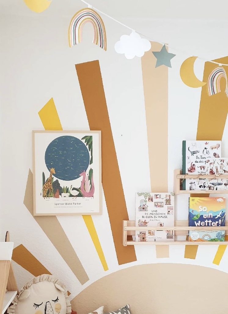 Was für eine niedliche Ecke! Die Sonne macht doch sofort gute Laune, oder? Unser Sternenhimmel Poster von Marta Abad Blay passt einfach perfekt zu den Wandfarben! Wir sind sehr stolz, dass unsere Designs ein Teil dieses tollen Kinderzimmers sind.
