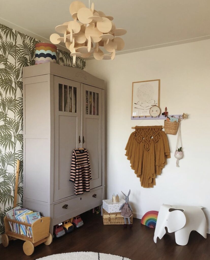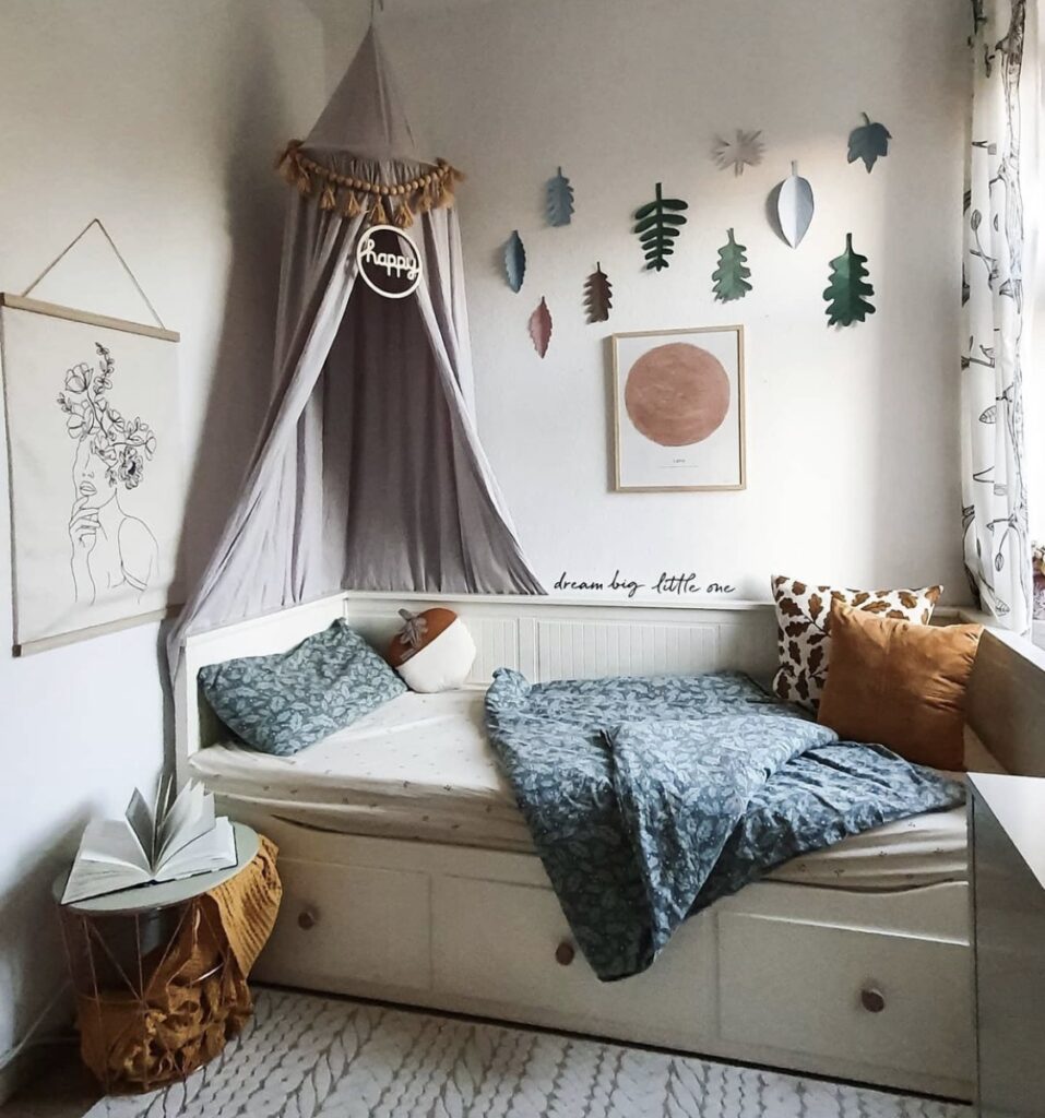 Dieses Bild lässt uns von magischen Wäldern träumen. So ein wunderschöner Raum! Die funkelnden kleinen Lichter der Mondlampe spiegeln sich in unserem Sternenhimmel von Marta Abad Blay. Süße Träume in diesem verträumten Raum!