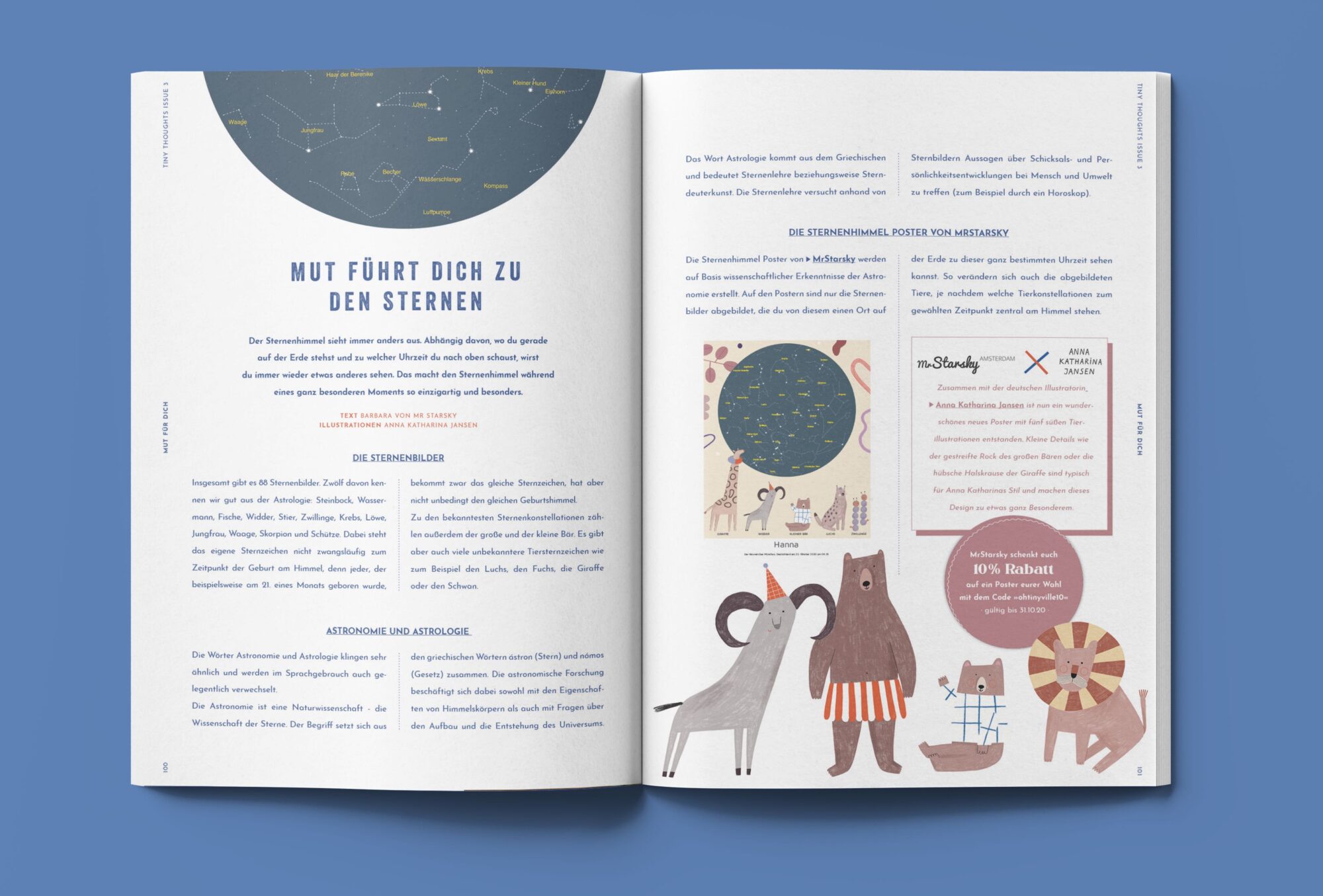 Den Kleinsten unter uns ist auch eine eigener Teil im Magazin gewidmet. Auf einer wunderschön illustrierten Doppelseite geben wir spannende Infos zum Sternenhimmel – da lernen auch die Eltern noch was dazu :) Die niedlichen Illustrationen von unserer Kooperation mit der großartigen Anna Katharina Jansen machen den Beitrag einfach perfekt. Für alle Leser gibt es am Ende auch noch ein besonderes Goodie – neugierig? Dann hol dir jetzt die neue digitale Ausgabe der tiny thoughts.