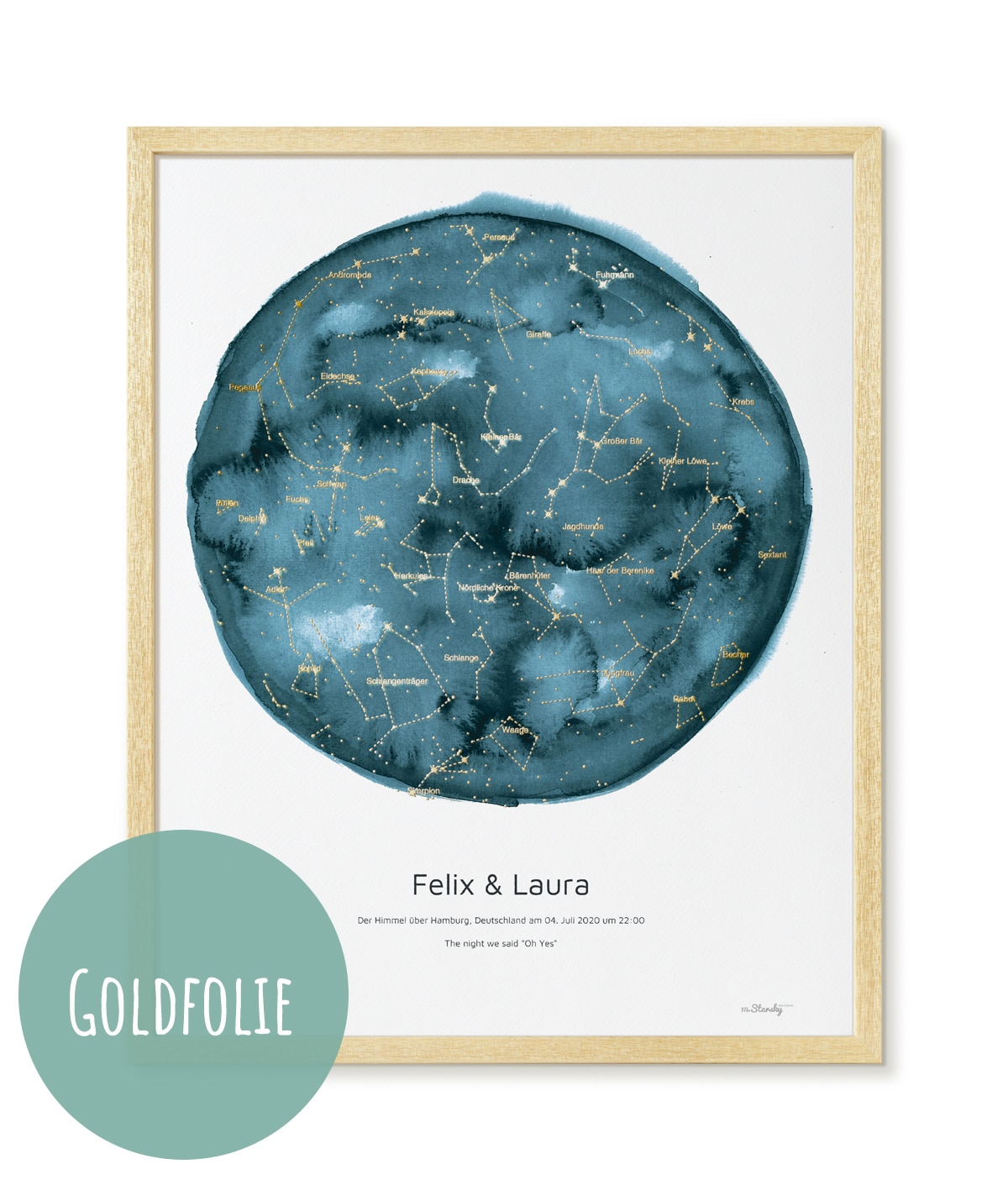 Der Moment, in dem man Mutter und Vater wird ist ein unvergesslicher Moment! Mit den Sternenhimmel-Postern von MrStarsky verewigt man diesen Moment und kann sich immer daran erinnern. Ein stilvoller Sternenhimmel mit Goldfolie oder ein fröhlicher Sternenhimmel mit Tierillustrationen für das Kinderzimmer – Du gestaltest das Poster ganz nach deinen Wünschen!