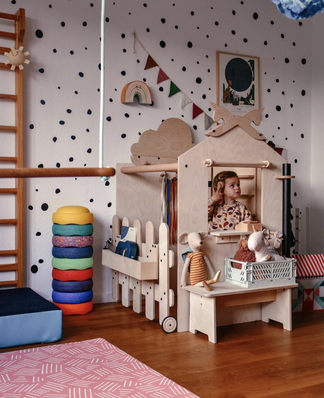 Ring ring… While sweet little Jette is busy making phone calls, we are admiring her cute room. Such beautiful toys and wonderful wallpaper! Our MrStarsky x Marta Abad Blay colors match perfectly…