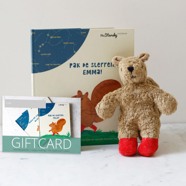 A beautifully wrapped box containing a gift card for our personalized children’s book ‘Reach for the stars,…!’ plus the Little Squirrel stuffed animal made in an exclusive collaboration with well-known German brand Senger Naturwelt.