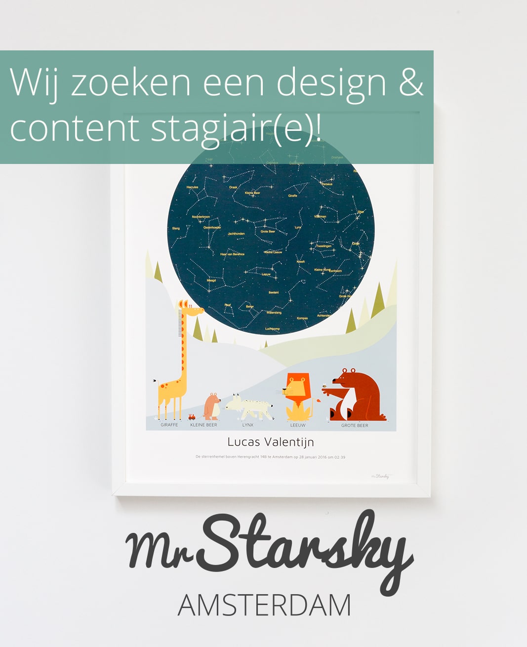 MrStarskyAmsterdam is in 2017 opgericht door Liesbeth en Fennechien. We ontwikkelen posters met de stand van de sterren, afhankelijk van de plaatst/datum/tijd in te vullen op de website www.MrStarskyAmsterdam.com. Op die manier ontstaat altijd een unieke poster, die je kunt gieten in een stijl naar keuze. Voor de ontwikkeling van deze stijlen werken we samen met getalenteerde kunstenaars en vormgevers. We blijven altijd druk bezig met het ontwerpen van nieuwe posterstijlen, waar jij als stagiair(e) ook betrokken bij zal zijn!