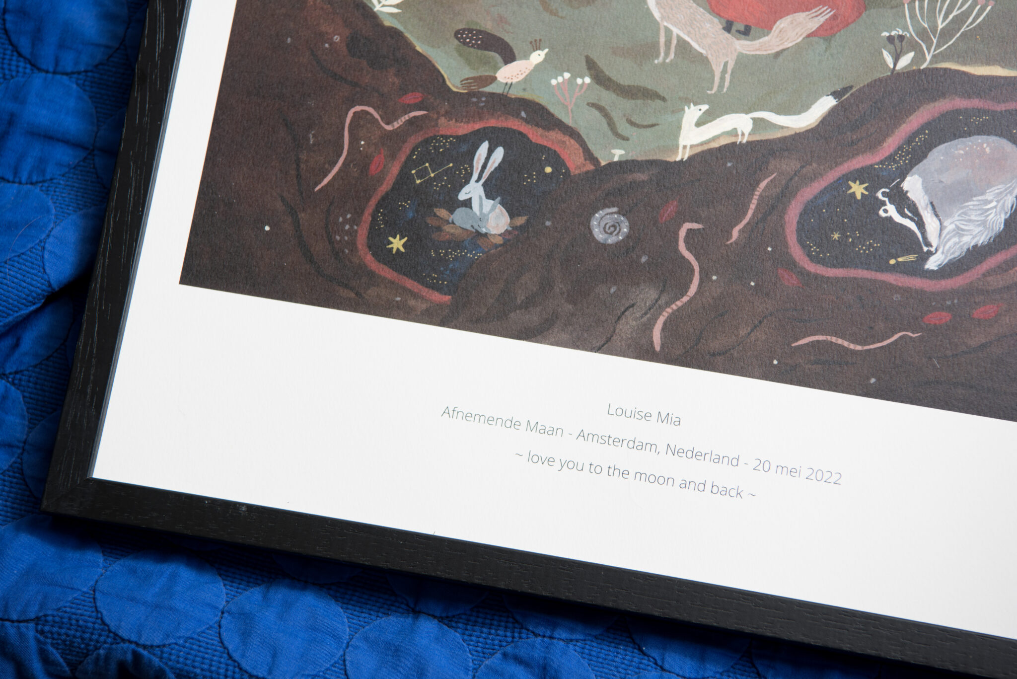 Het eerste item in de collectie maanposters is een samenwerking met illustrator Tijana Lukovic. Samen met Tijana willen wij met deze maanposter een sprookjesachtige droomwereld creëren waarin belangrijke mijlpalen in het leven van een kind extra aandacht krijgen en voor altijd vastgelegd kunnen worden. Dit kan de geboorte zijn, maar ook een onvergetelijke verjaardag of een allereerste schooldag. Hoe stond de maan toen?