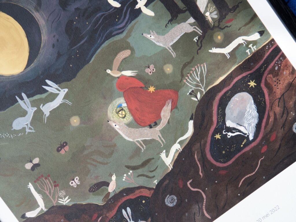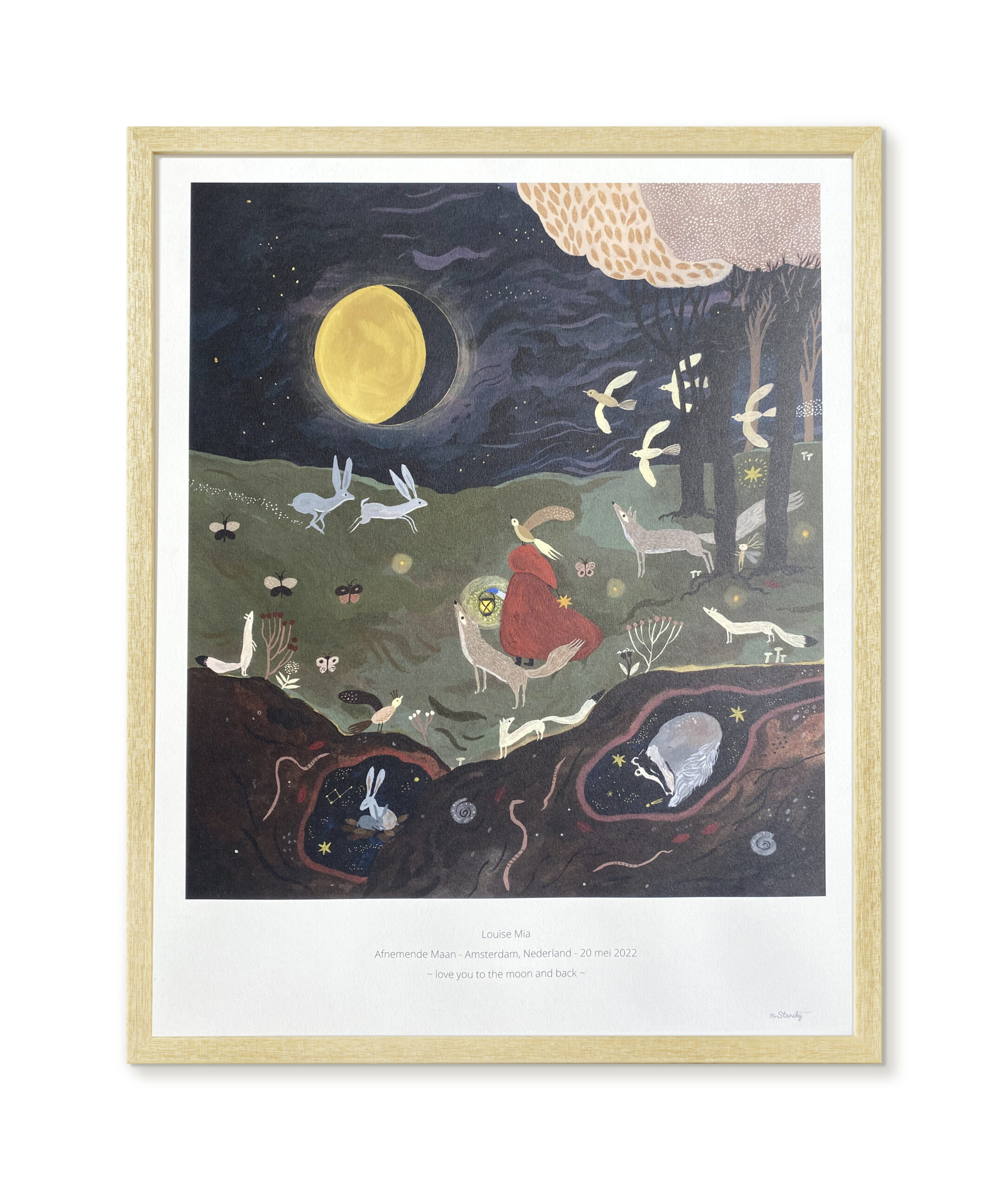 Extra plezier met de maanposter, omdat het ook een zoekplaatje is! Na aankoop van jouw gepersonaliseerde maanposter ontvang je digitaal ‘de maanposter zoek-legenda’. Met dit overzicht kan je samen met je kid(s) de sprookjesachtige diertjes en bijzondere planten op de poster zoeken. Spot jij de witte wezels en hoeveel paddenstoelen tel jij?