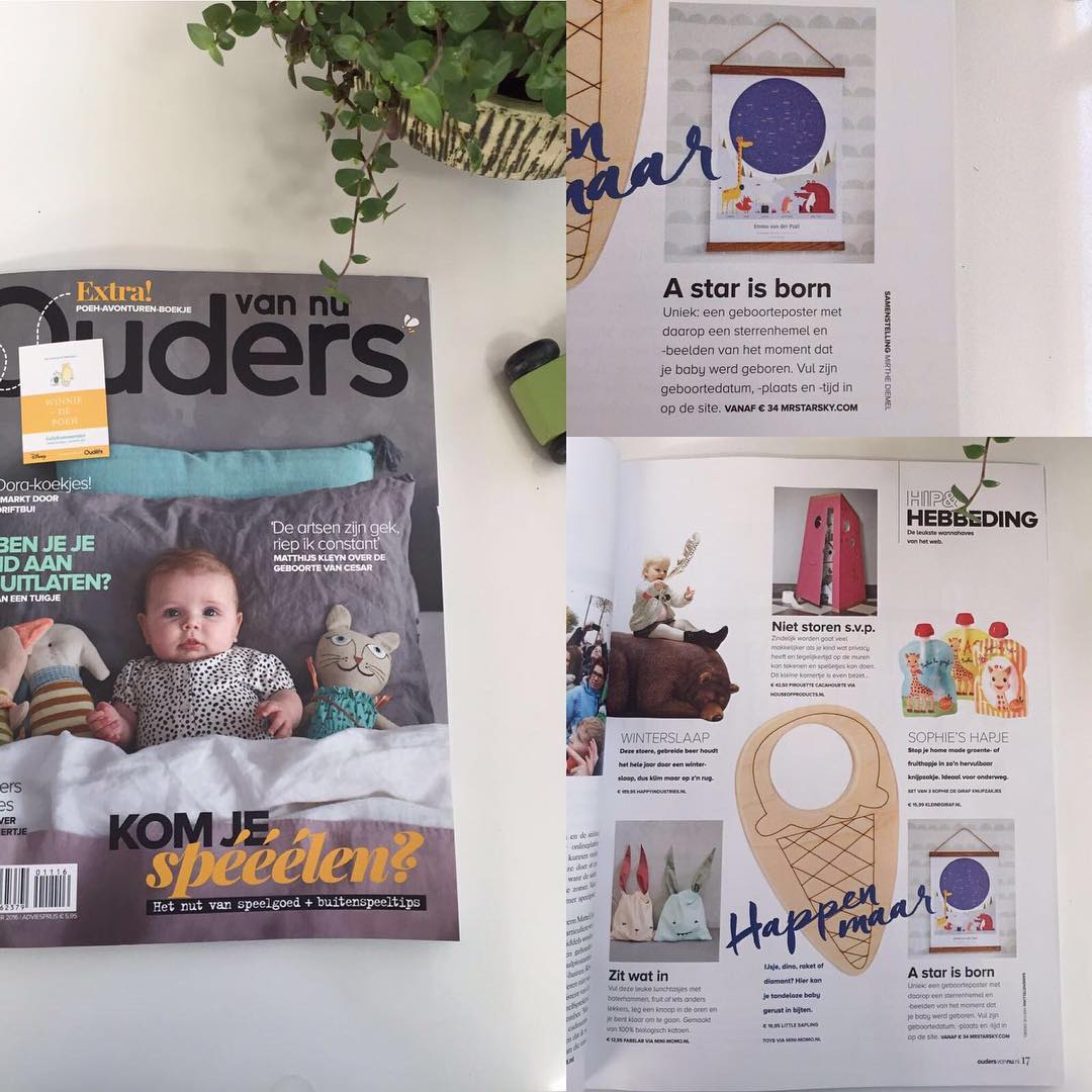 Wij zijn erg trots op onze vermelding in Ouders van Nu, in de rubriek ‘hip en hebbeding – de leukste wannahaves van het web’ editie september 2016! Dit zeggen ze over ons: ‘A star is born. Uniek: een geboorteposter met daarop een sterrenhemel en -beelden van het moment dat je baby werd geboren. Vul zijn geboortedatum, -plaats en -tijd in op de site www.mrstarskyamsterdam.com.’