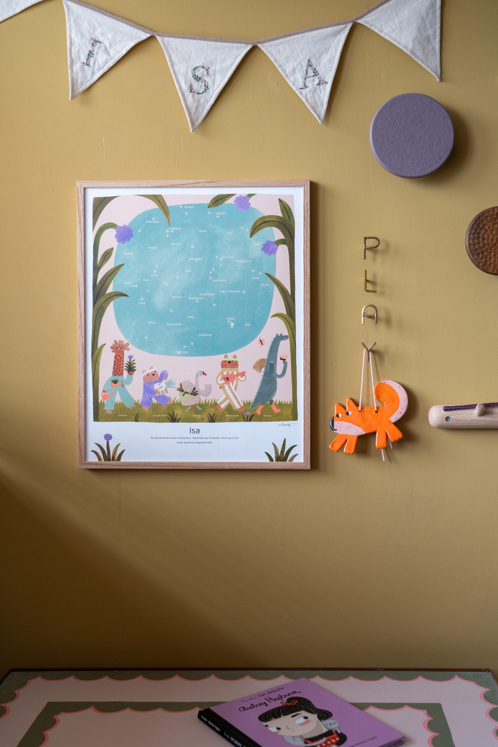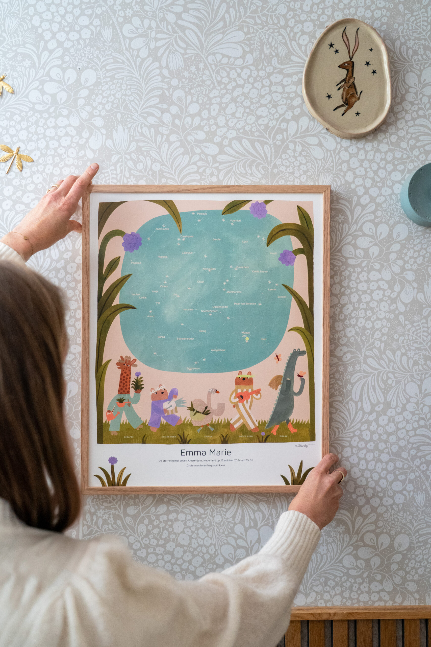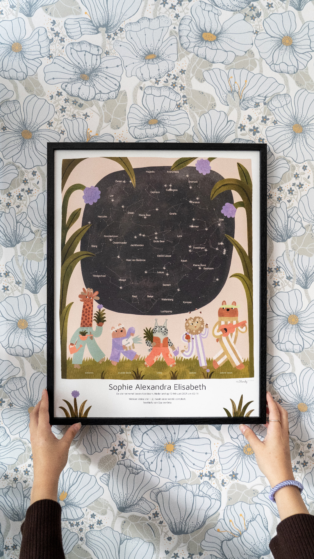 Voor elk kind (of ouder) is het een betoverend idee: de hemel precies zoals die stond op jouw geboortedag, gevangen in een kunstwerk dat alleen van jou is. De vijf sterrenbeelden die op dat moment aan de hemel schitteren, verschijnen als dieren in een vrolijke stoet onder de sterren. Ze wandelen door gras en bloemen, dragen vlaggetjes, planeten of vruchten, en worden vergezeld door kleine insecten. Elk detail is getekend in de herkenbare stijl van Aniek Bartels — speels, stoer en vol liefde voor de natuur.