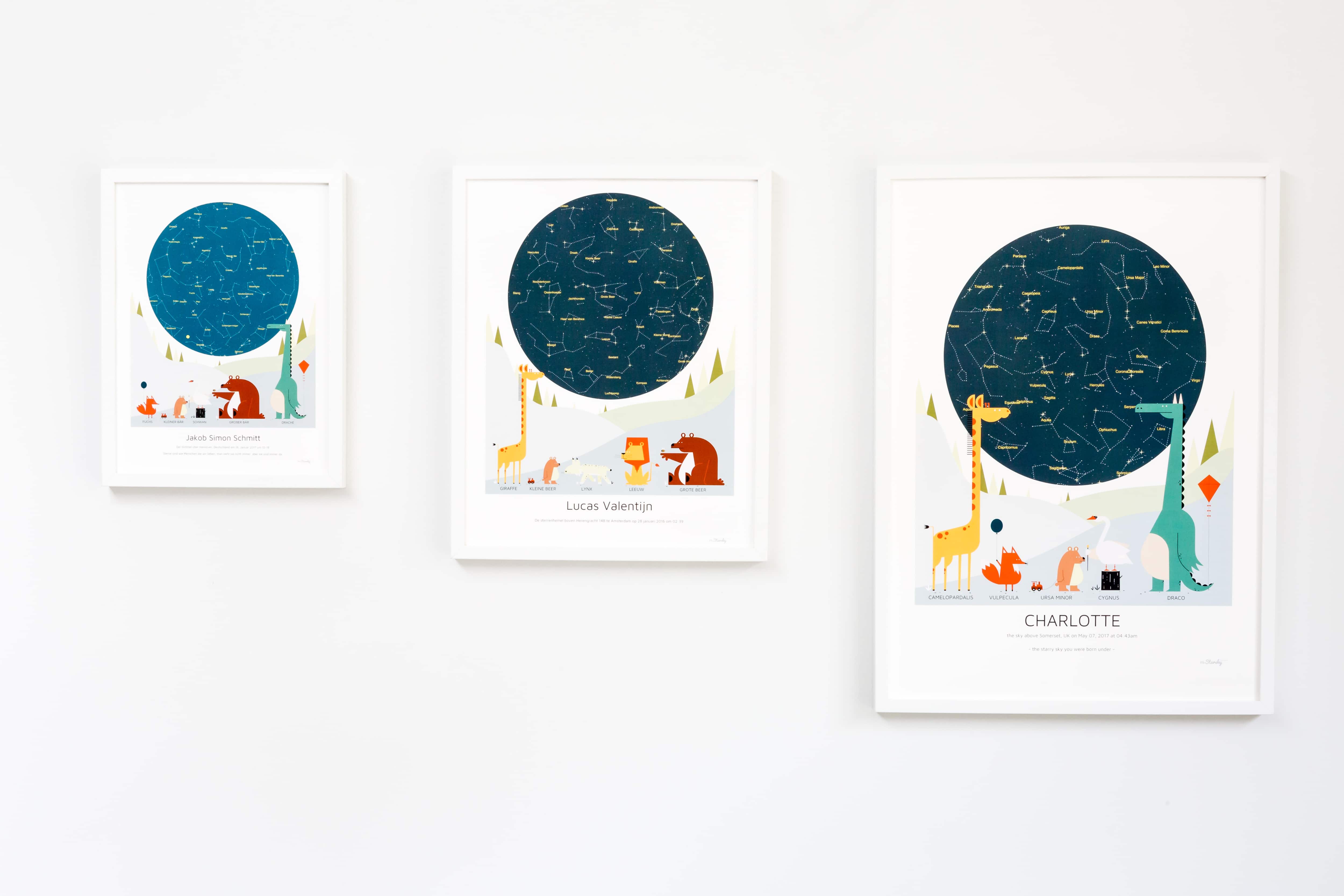 Ook overdag staan er sterren aan de hemel, maar door het zonlicht zien we die niet. Bij MrStarsky hebben wij ervoor gekozen om op de poster de overdag-hemel een lichtere kleur te geven en ook de zon te laten zien (een gele ronde vorm met ‘zon’ erbij). Bovendien zijn er posters met vijf illustraties van sterrenbeelden die centraal aan jouw sterrenhemel staan. De illustraties wisselen dus mee met de stand van de sterren!