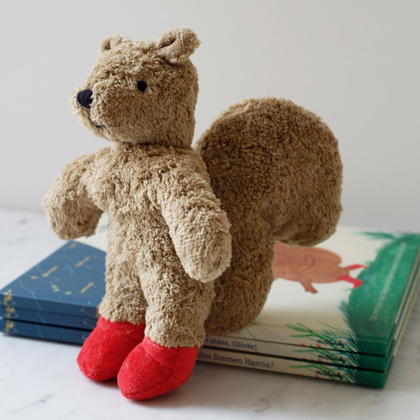 De Eekhoorn knuffel is handgemaakt met de grootste zorg en bestaat uit louter natuurlijke materialen van biologische herkomst. Met deze knuffel komt het hoofdpersonage uit het gepersonaliseerde voorleesboek ‘Pak de sterren,…!’ helemaal tot leven.