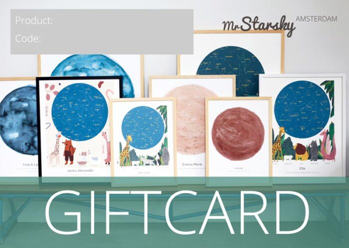 Met de MrStarsky giftcard kan de ontvanger zelf in onze webshop een poster maken. Een origineel cadeau voor een bijzonder moment zoals een geboorte, een huwelijk, een verjaardag of een jubileum!