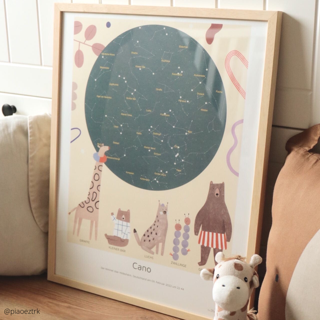 Onze dierenposters zijn super leuk om samen met je kind naar de sterren te kijken én dierennamen te oefenen – perfect voor de kinderkamer: kleurrijk, vrolijk en een ideaal onderdeel voor het slapen gaan! Het leuke is dat je de sterrenbeelden aan de hemel kunt zoeken en de dierenillustraties hierbij kunt gebruiken. De dierenillustraties zijn namelijk allemaal sterrenbeelden die aan de geboortehemel van jouw kindje stonden (dus niet ieder rijtje dieren is hetzelfde!).