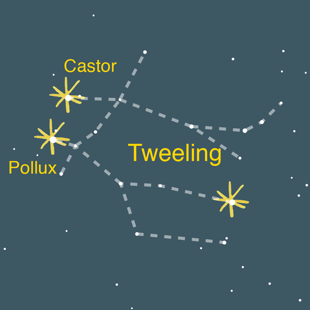 Als je goed kijkt naar het sterrenbeeld Tweelingen dan zie je ook echt twee ‘poppetjes’ samen hand in hand staan! Het kijken naar de sterrenbeelden vormt ook het creatief kijken. Enorm belangrijk voor de ontwikkeling van een kind, in onze ogen!