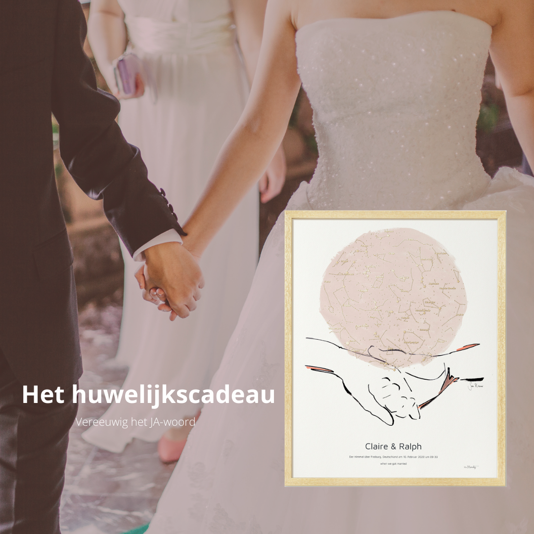 Onze sterrenhemel posters kunnen ook als huwelijkscadeau gegeven worden! Hierdoor geef je een unieke verassing om de liefde te vieren. Dit kan zijn om je eigen jubileum te vieren maar is nog leuker om als cadeau te schenken aan een (pas getrouwd) stel!